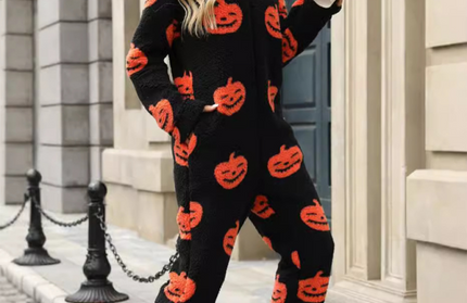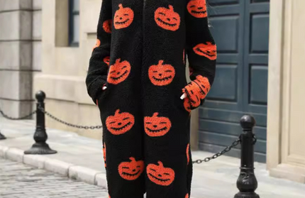 Halloween Pumpkin Zipper Loose Plush Jumpsuit