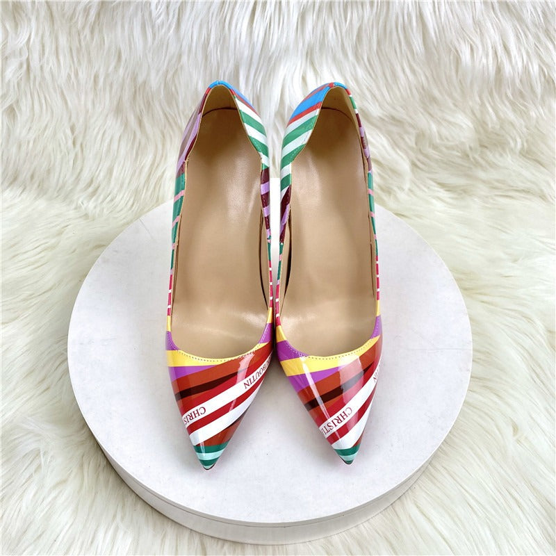 Popular Elements Shallow MouthToe shape pointed toeUpper material: patent leatherHeel height super high heels (above 8CM)Pattern stripeColorful 12CM, Colorful 10CM,...